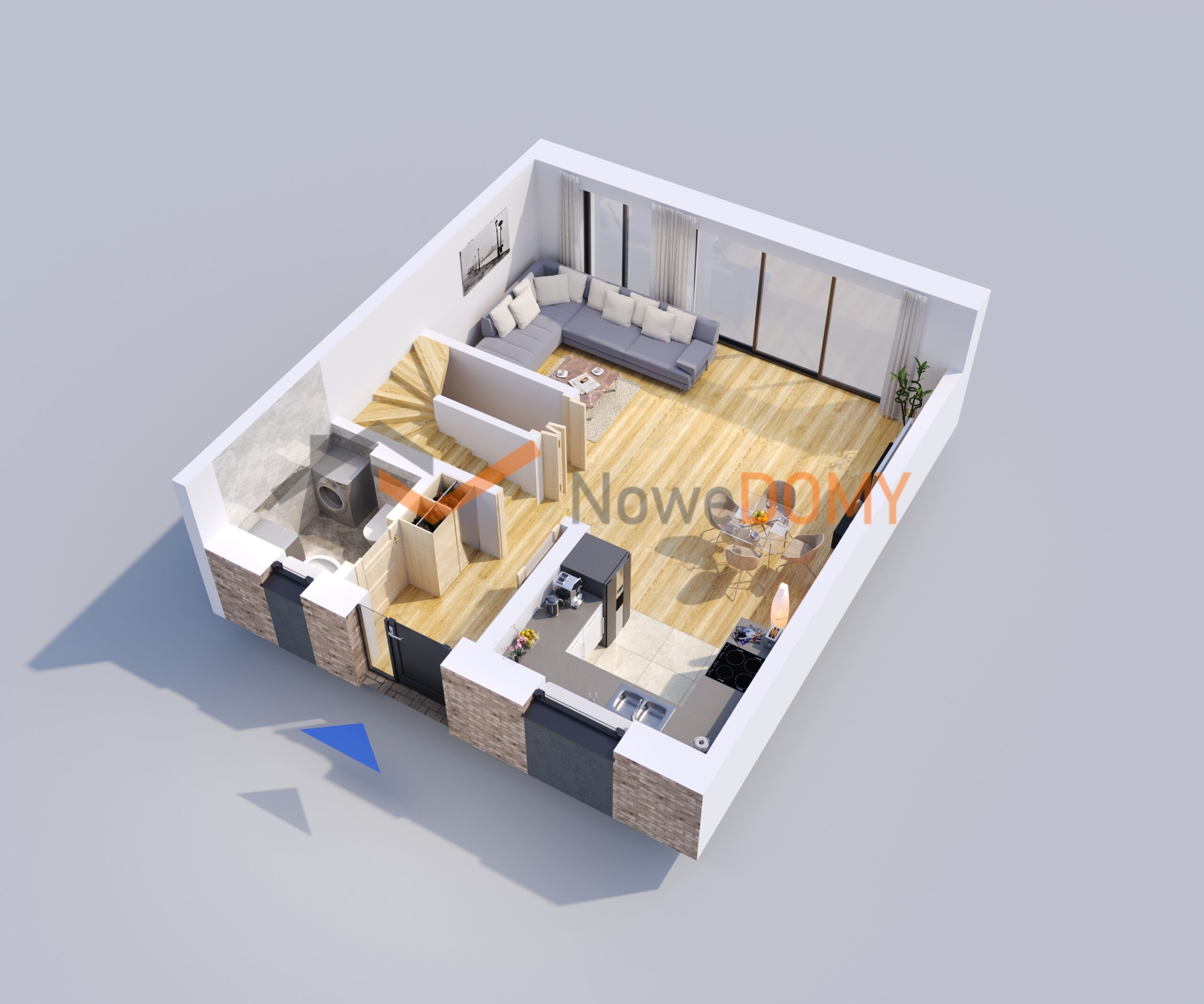 • architektura – nowoczesna bryła z dużymi przeszkleniami, kolorystyka utrzymana w bieli, szarości z elementami drewna,