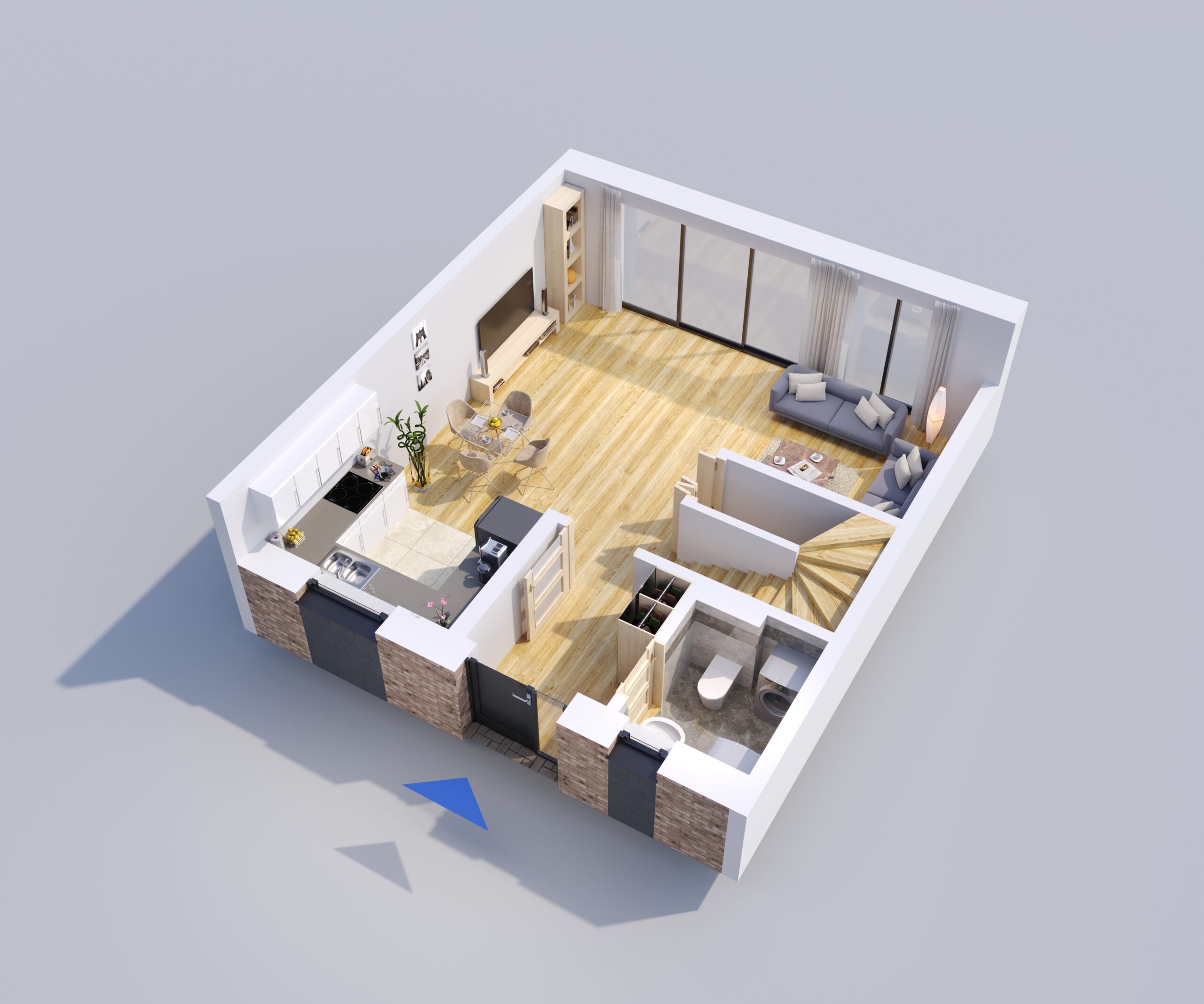 - architektura – nowoczesna bryła z dużymi przeszkleniami, kolorystyka utrzymana w bieli, szarości z elementami drewna,