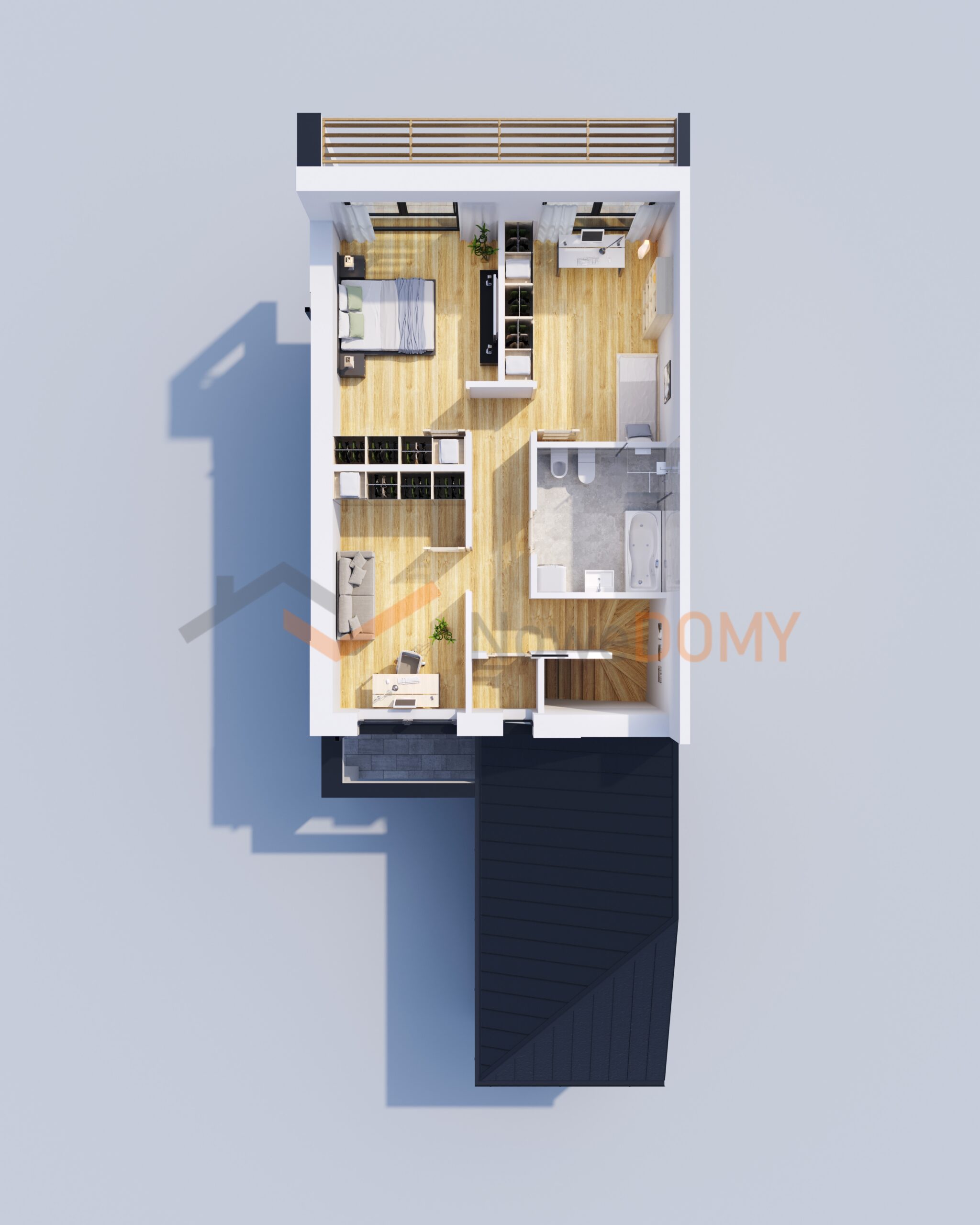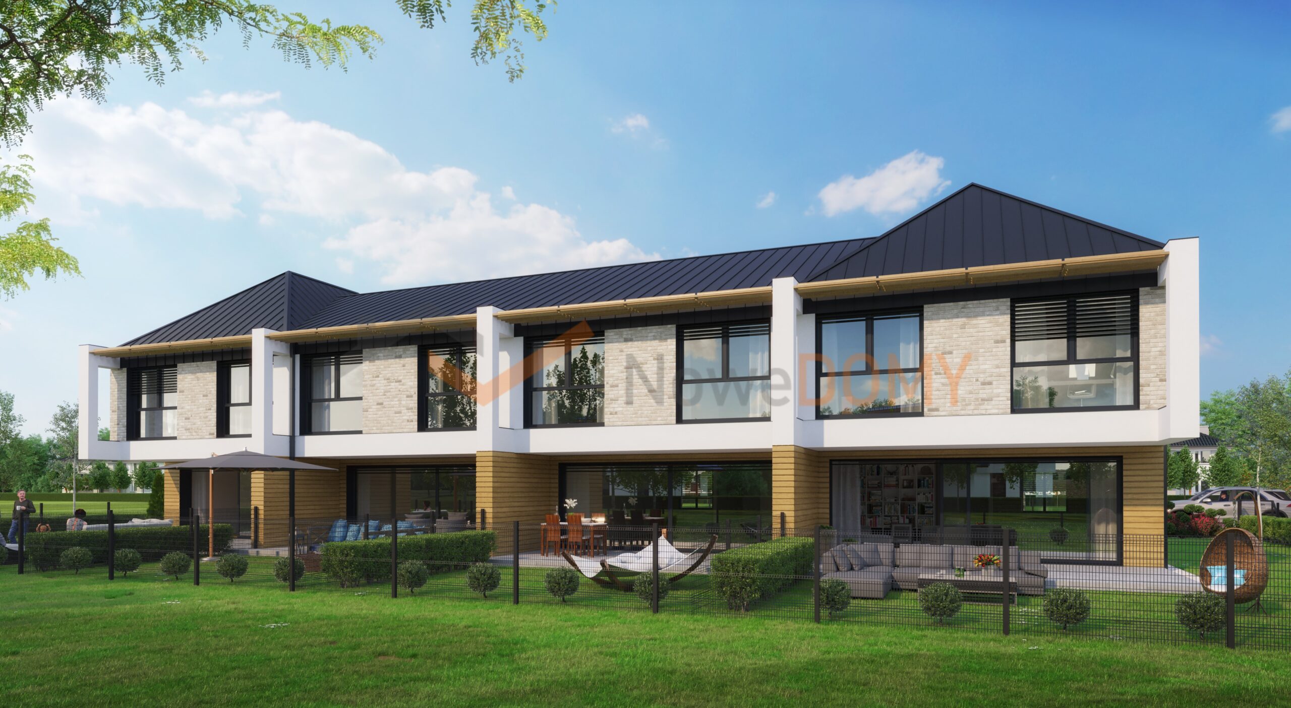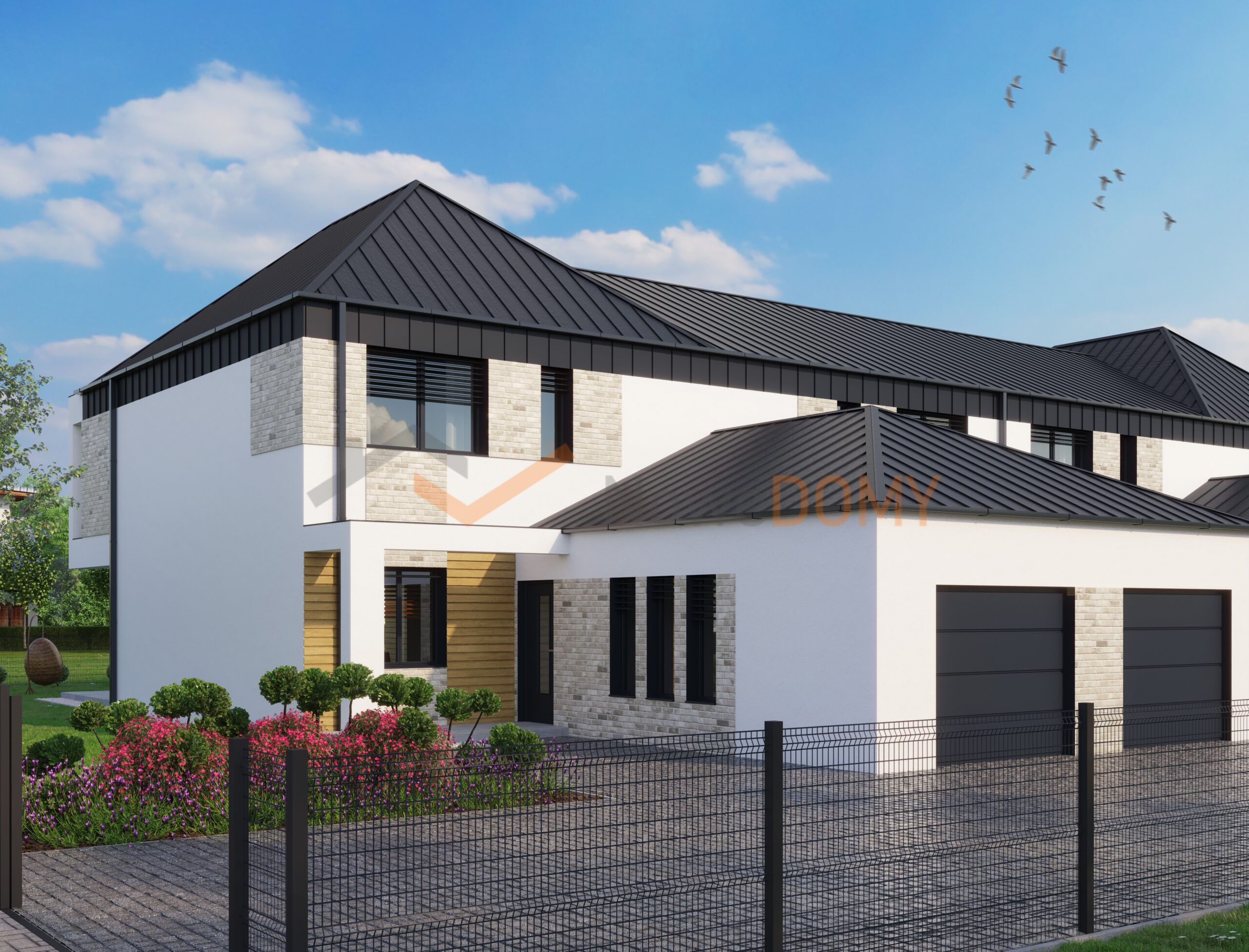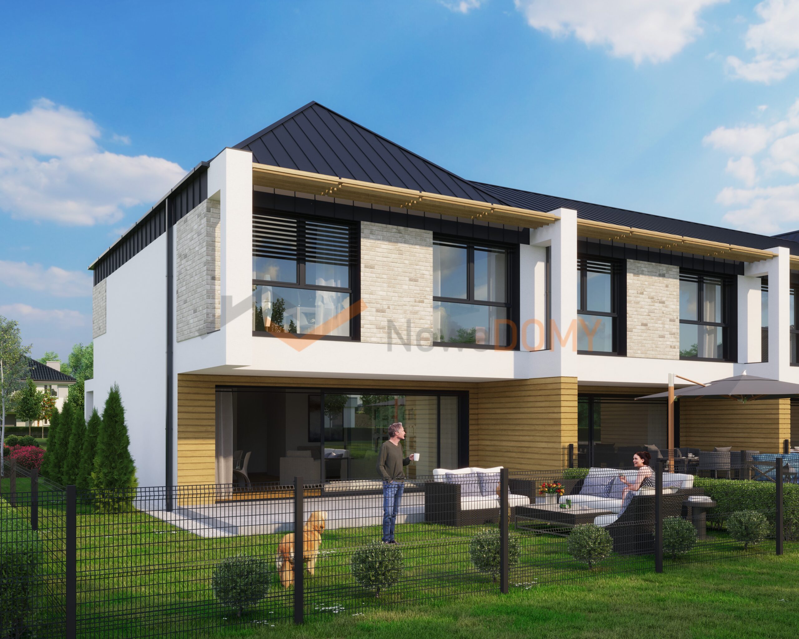 - architektura – nowoczesna architektura z dużymi przeszkleniami, w biało-szarej kolorystyce z elementami wysokiej jakości kompozytu imitującego drewno i cegły klinkierowej,